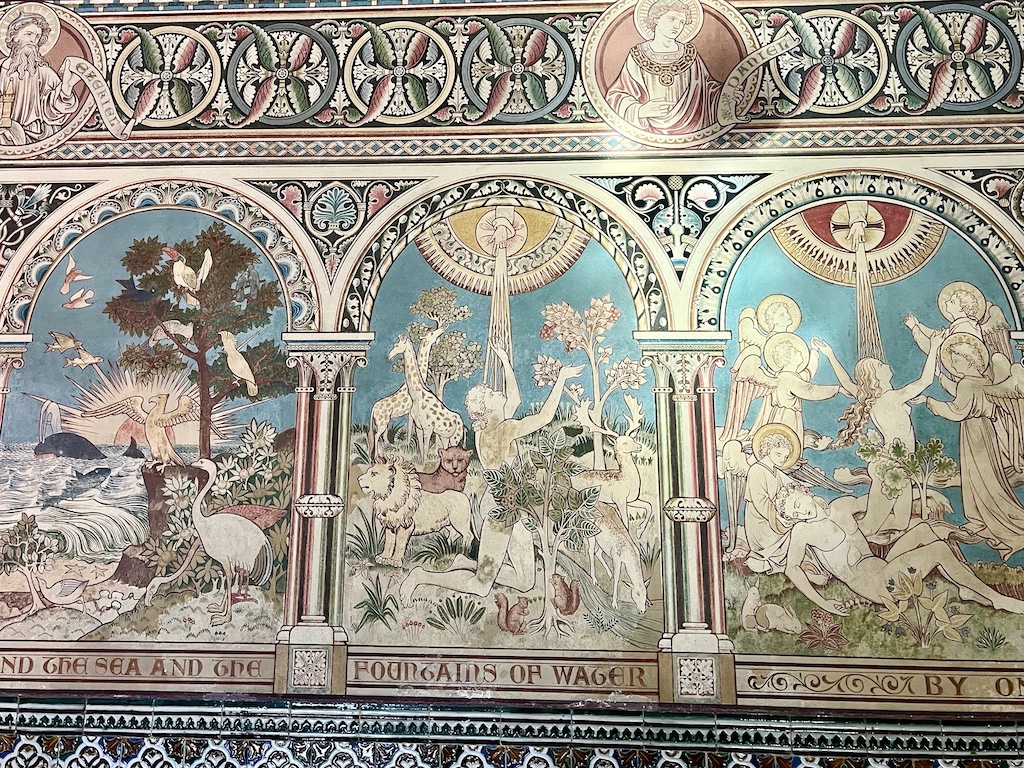 In 1872, the 5th Baronet employed the renowned architect GE Street to furnish the church and he was responsible for the paintings. He worked with Clayton and Bell who were glaziers to ensure that the stained glass was in keeping with the paintings and they definitely all did a great job!